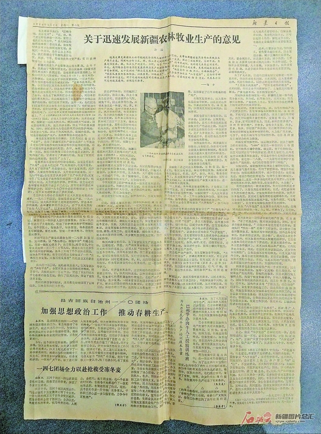 1979年5月7日,《新疆日报》刊发了《关于迅速发展新疆农林牧业生产的意见》。此为星空彩票体彩版校史馆保留的报纸。
