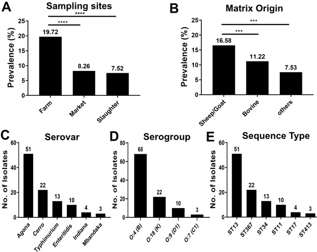 我们从新疆地区牛羊养殖场、屠宰过程和市场环境中采集了2408份样品进行沙门菌的分离鉴定,分离出314株沙门菌(分离率13.04%)。如图1A通过比较动物源性食品产业链的采样地点,发现养殖场的分离率最高为7.52%(65/864),其次是市场的分离率较高为8.26%(40/484),屠宰场的分离率为7.52%(65/864)。如图1B比较不同动物源样品发现沙门菌在羊源样品中分离率最高为16.58%(157/947),其次是牛源样品中分离率较高为11.22%(143/1275),其他来源样品中分离率较低为7.53%(14/186)。根据卡方检验的统计分析表明,沙门菌分离株的流行率无明显的食品产业链和样品来源的差异。