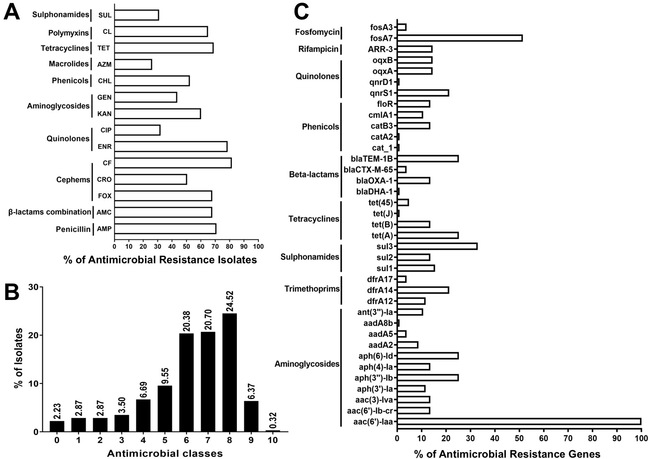 采用肉汤稀释法对314株沙门菌进行了14种抗菌药物的耐药性调查,发现92.04%的沙门菌是多重耐药菌株(如图2B),其中四环素的耐药率是78.03%(245/314),阿莫西林/克拉维酸的耐药率是75.80%(238/314),氨苄青霉素的耐药率是70.70%(222/314)。采用浙江大学建立的Galaxy平台,基于九类抗生素耐药性的37个耐药基因进行预测,发现所有菌株均携带有氨基糖苷的aac(6’)-Iaa基因,有53株(51.45%)沙门菌携带有耐磷霉素的fosA7基因,有34株(33.01%)沙门菌携带有耐磺胺类的sul3基因,有26株(25.24%)沙门菌携带有耐氨基糖苷类的aph(6)-Id基因、四环素类的tet(A)基因和β-内酰胺类的blaTEM-1B基因(图2C)。另一方面,比较分析了表型检测和基因预测的抗生素耐药性数据的差异(图2A和C)。
