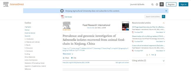 2021年4月在Food Research International(IF 6.475, 1区)期刊杂志上发表了论文“Prevalence and Genomic Investigation of Salmonella Isolates Recovered from Animal Food-chain in Xinjiang, China”。这是我们首次报道了在新疆地区动物源性食品产业链中污染流行的多重耐药沙门菌,及其携带编码的关键毒力因子情况,通过采用全基因组测序平台对沙门菌进行溯源研究有助于对食品产业链上出现的多重耐药菌的鉴定和早期控制。