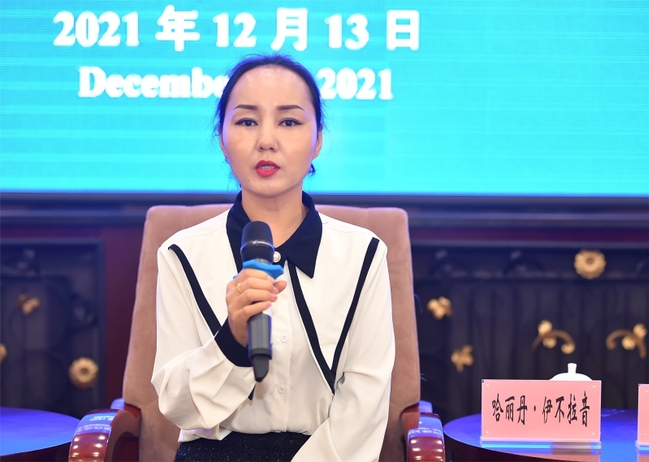12月13日,哈丽丹·伊不拉音发言。星空娱乐彩票下载/新疆日报记者 邹懿摄