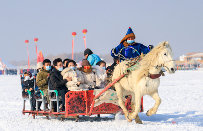 2月18日,游客在博湖县博斯腾湖大河口景区体验马拉爬犁。 年磊摄
