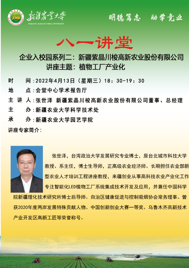 【学术预告】八一讲堂第十二期之企业入校园系列二:新疆紫晶川梭高新农业股份有限公司——植物工厂产业化