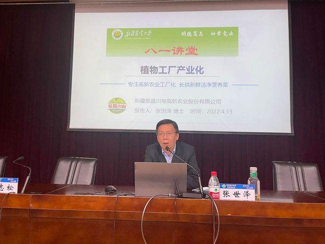 本次讲座的主题是《植物工厂产业化》,张世泽教授从解释什么是植物工厂入手,阐述了新疆发展植物工厂产业的重要意义。结合近年来的植物工厂生产经验与研发经历,由浅入深的讲述了植物工厂的环境调控方面的关键难点以及未来在畜牧养殖、单细胞蛋白培养、无种子生产技术等方面延伸应用的前景,展望植物工厂技术未来发展,并给即将毕业的大学生解答了升学、就业和创业的一些困惑。