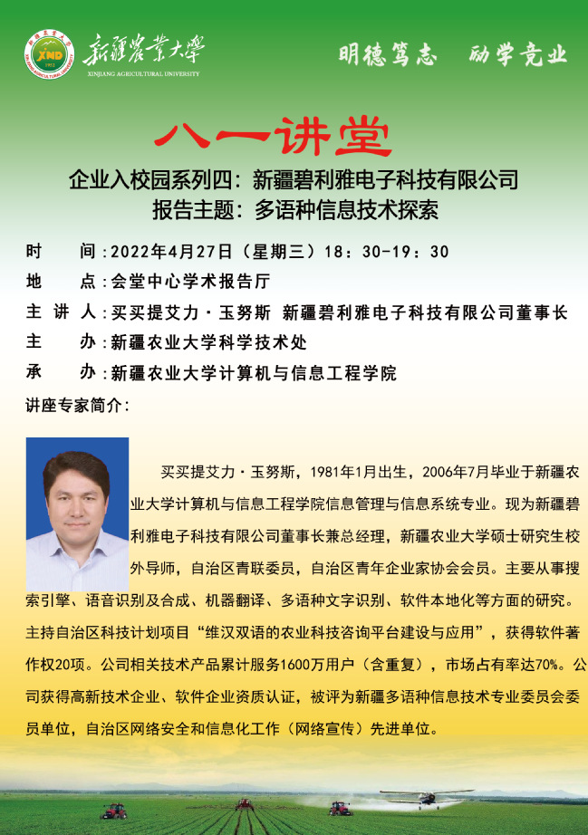 【学术预告】八一讲堂第十四期之企业入校园系列四:新疆碧利雅电子科技有限公司报告主题 多语种信息技术探索