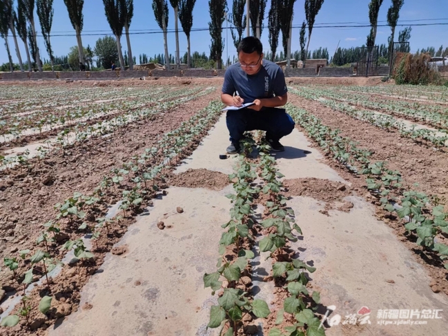 查看虫害、观察记录棉苗生长情况……5月17日,顶着烈日,在库车市陆地棉试验站,钱帅帅正在进行田间调查,豆大的汗珠从他的脸颊滑落。