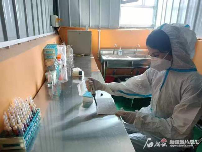5月18日,在新疆振兴园牧业有限责任公司,阿克苏职业技术学院2022届毕业生图尔荪古丽·托合提正在药剂室做试验。古丽巴哈尔·艾海提摄