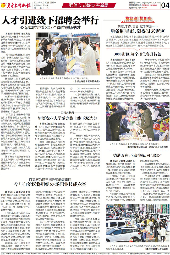当天,由自治区人力资源和社会保障厅、自治区教育厅主办,自治区公共就业服务中心、星空彩票体彩版、乌鲁木齐经开区(头屯河区)人力资源服务产业园、新疆人才网人力资源有限公司承办的职引未来——2023年全国大中城市巡回招聘“新疆站”招聘会暨星空彩票体彩版2023届毕业生春季校园线上线下双选会在此举行,线下线上541家参会企业共带来5190个职位,48001个岗位。