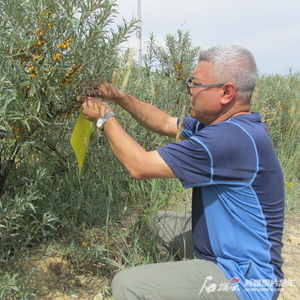 阿地力·沙塔尔调研时为沙棘抓沙棘绕实蝇。受访者本人供图
