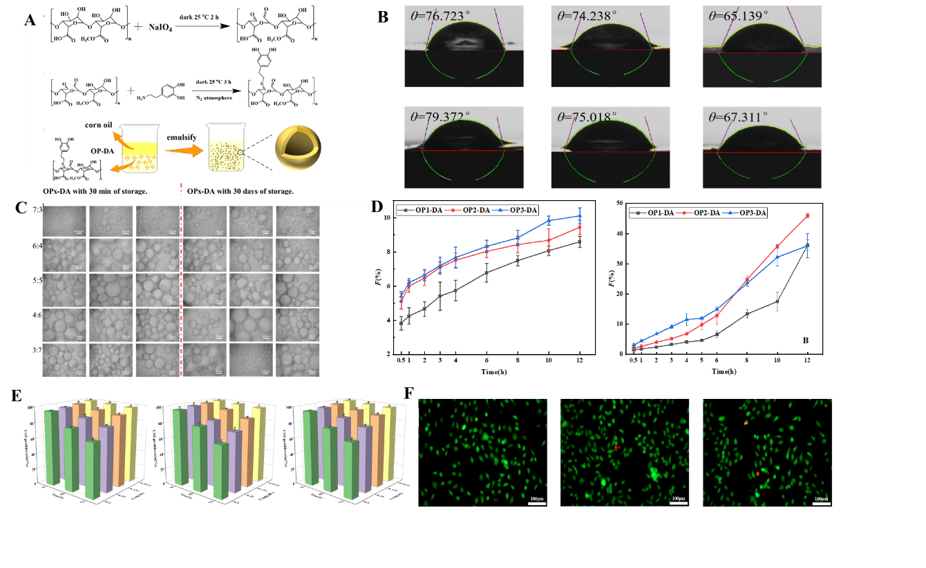 图1 Pickering乳液药物缓释系统的表征及性能 (A) 制备示意图;(B)多巴胺改性对果胶润湿性的影响;(C) Pickering乳液的稳定性;(D) Pickering乳液药物缓释系统在不同模拟条件下的释放性能;(E) L929细胞的细胞相容性;(F) 细胞毒性的荧光表征。