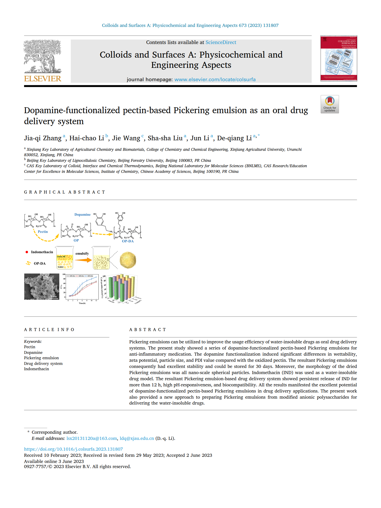 近日,星空彩票体彩版化学化工学院李德强副教授在Colloids and Surfaces A: Physicochemical and Engineering Aspects发表了一篇题为Dopamine-functionalized pectin-based Pickering emulsion as an oral drug delivery system的研究论文,研究了一系列多巴胺功能化的果胶基皮克林乳液用于亲脂药物的负载递送,该工作为其它杂多糖的改性及Pickering乳液的制备提供了新思路;另外,该方法可用于功能食品的开发领域。
