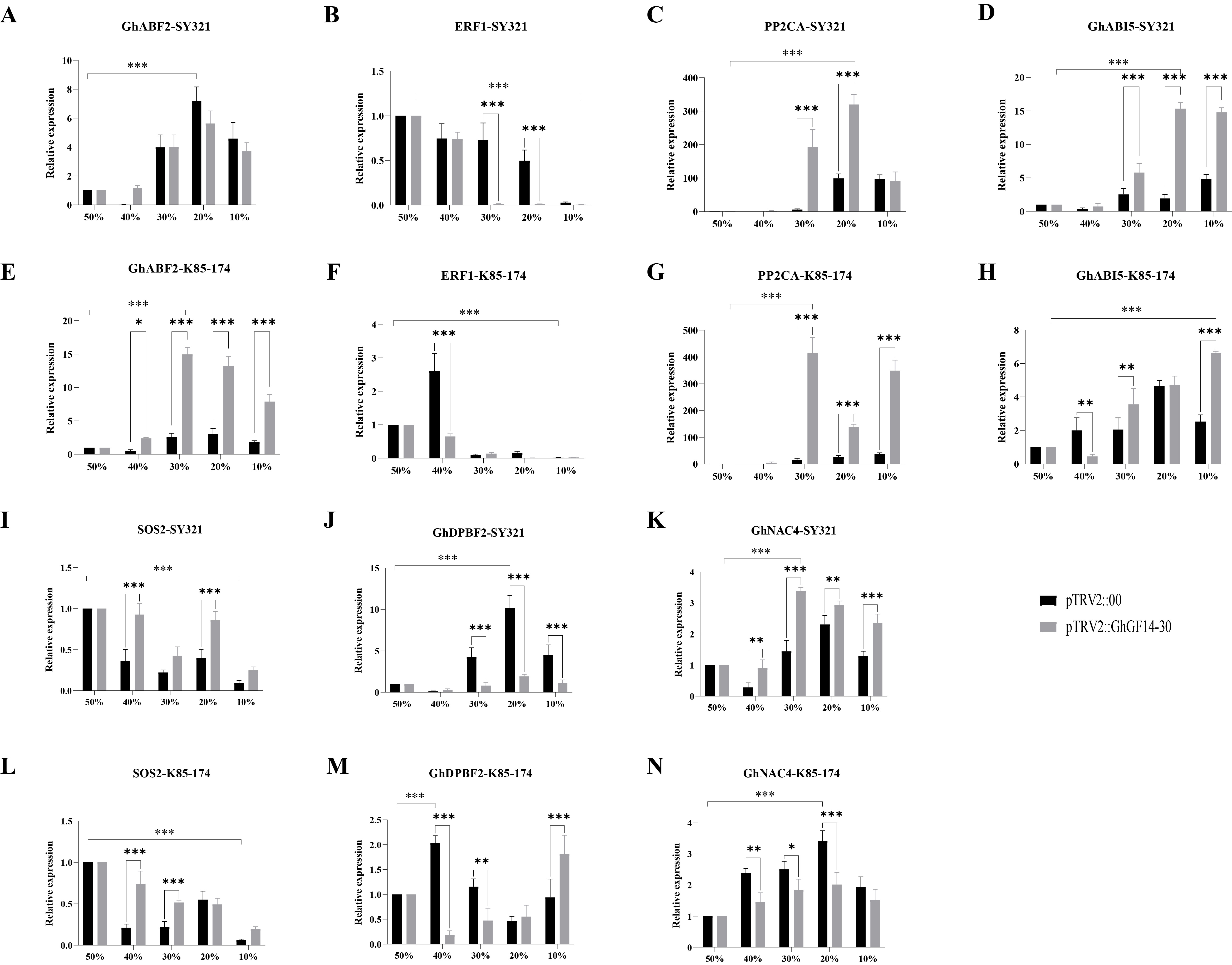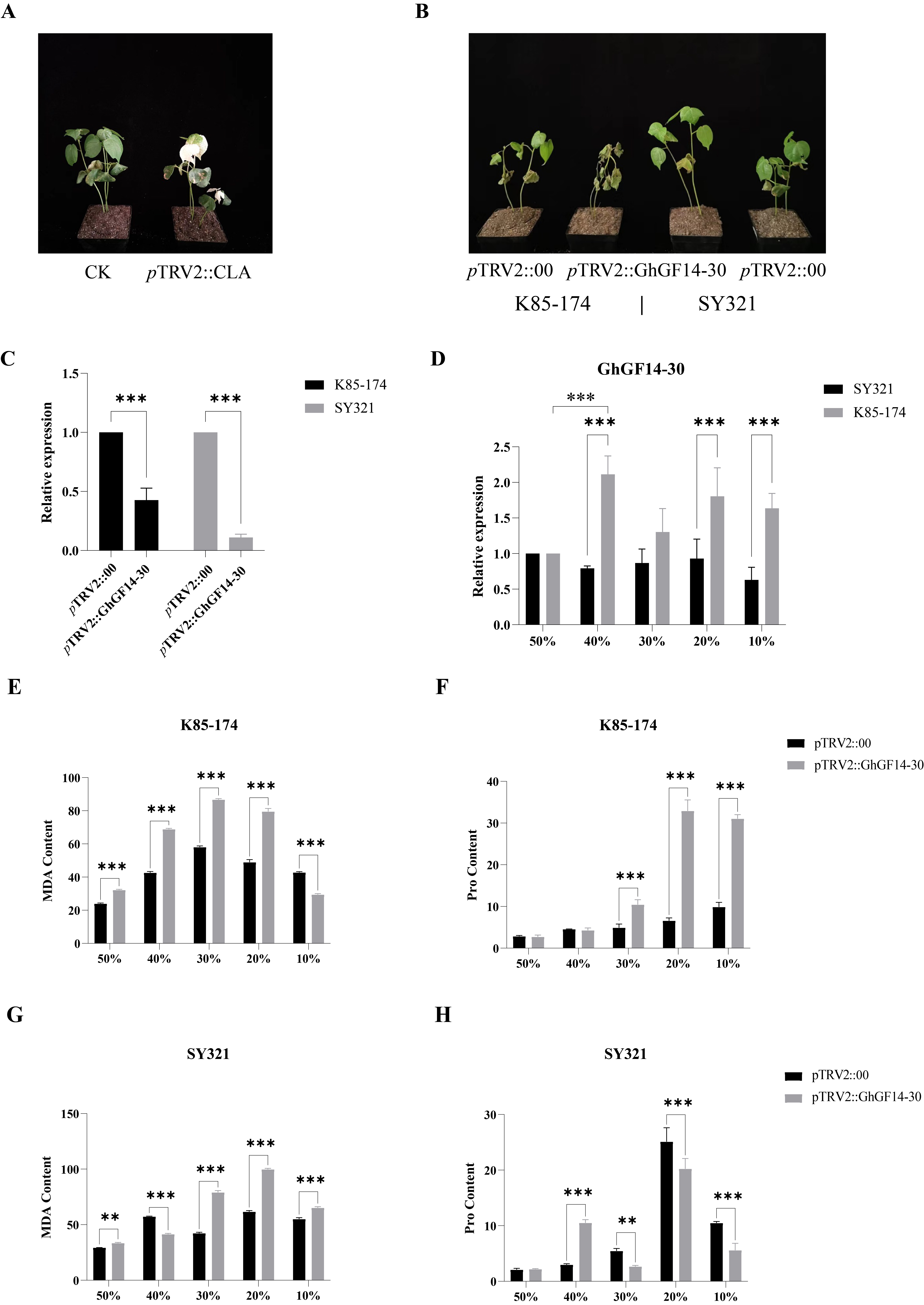 亲本的VIGS材料在受到干旱胁迫后表型上的明显差异,也代表着GhGF14-30基因可能在长势良好的抗旱材料SY321中并不是唯一能够行使增强植株抗旱性能力的基因,但是在抗旱优异基因表达可能相对较少的敏旱材料K85-174中,GhGF14-30基因又是极为关键的。这种可能,也许会为一些高产高品质却不抗逆的棉花材料带来新生。