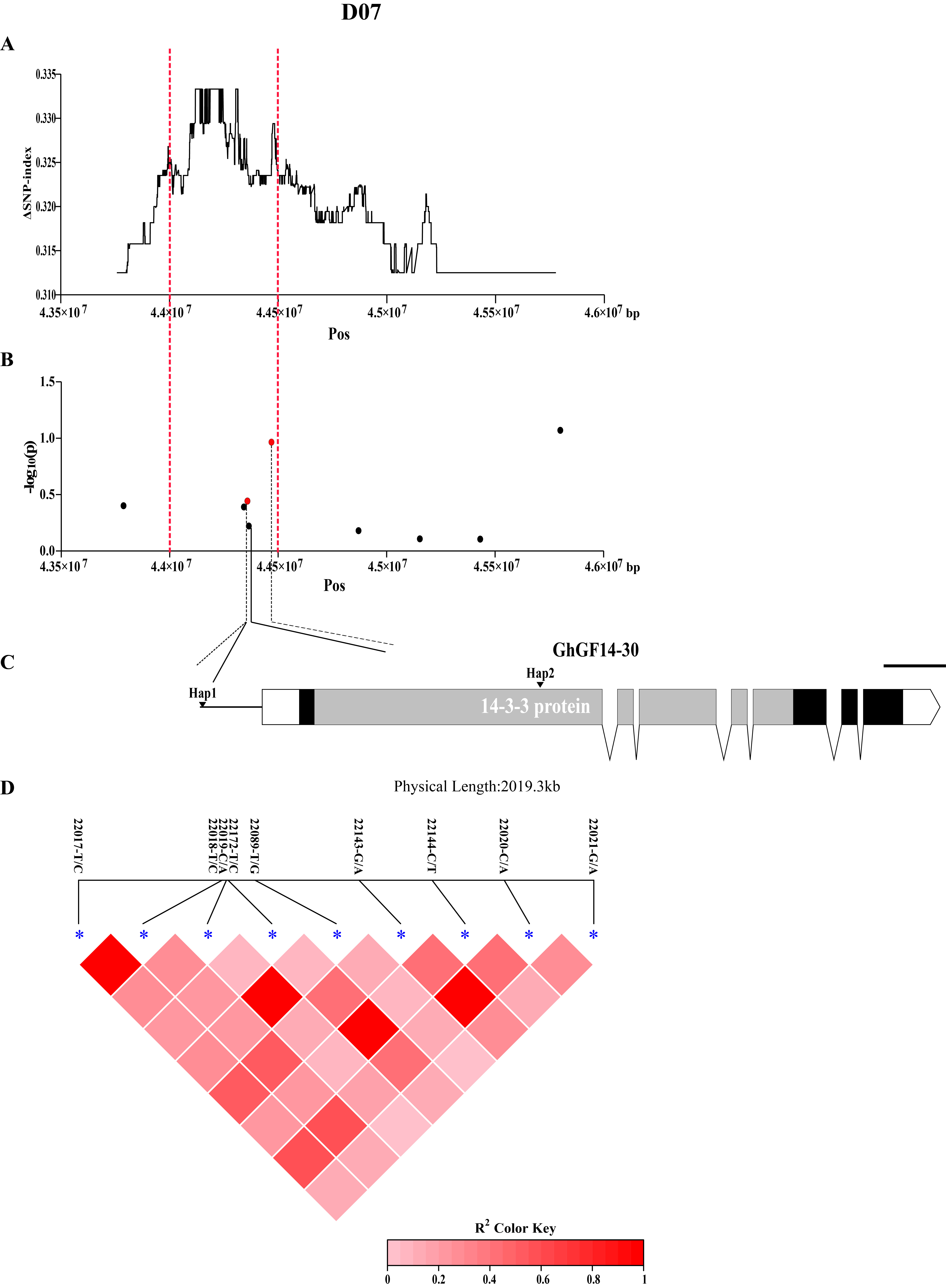 该研究基于抗旱性相关的RIL群体进行QTL区间的初定位,选择来源广泛的自然群体进行QTL区间的再定位,利用多态性KSAP标记与表型的关联,展开了对关键区间进一步的挖掘。最终,110Kb峰值区域的重叠代表了该QTL区间的真实性及重要性,在共定位区间内仅鉴定到一个被注释为GF14蛋白的关键候选基因GhGF14-30。