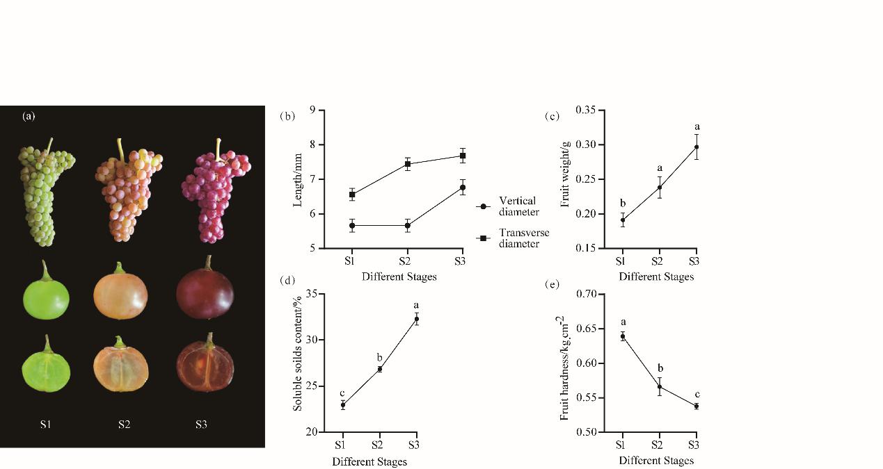 该研究首先对琐琐葡萄浆果成熟过程中的纵径、横径以及单果质量的表型指标和总酚、单宁、可溶性糖、Vc、可滴定酸和糖酸比的生理指标进行浆果品质动态变化分析。接下来开展了表型与生理指标的相关性分析。结果显示琐琐葡萄生长过程中浆果大小、单果质量与总酚、可溶性糖和可滴定酸有密切关系。