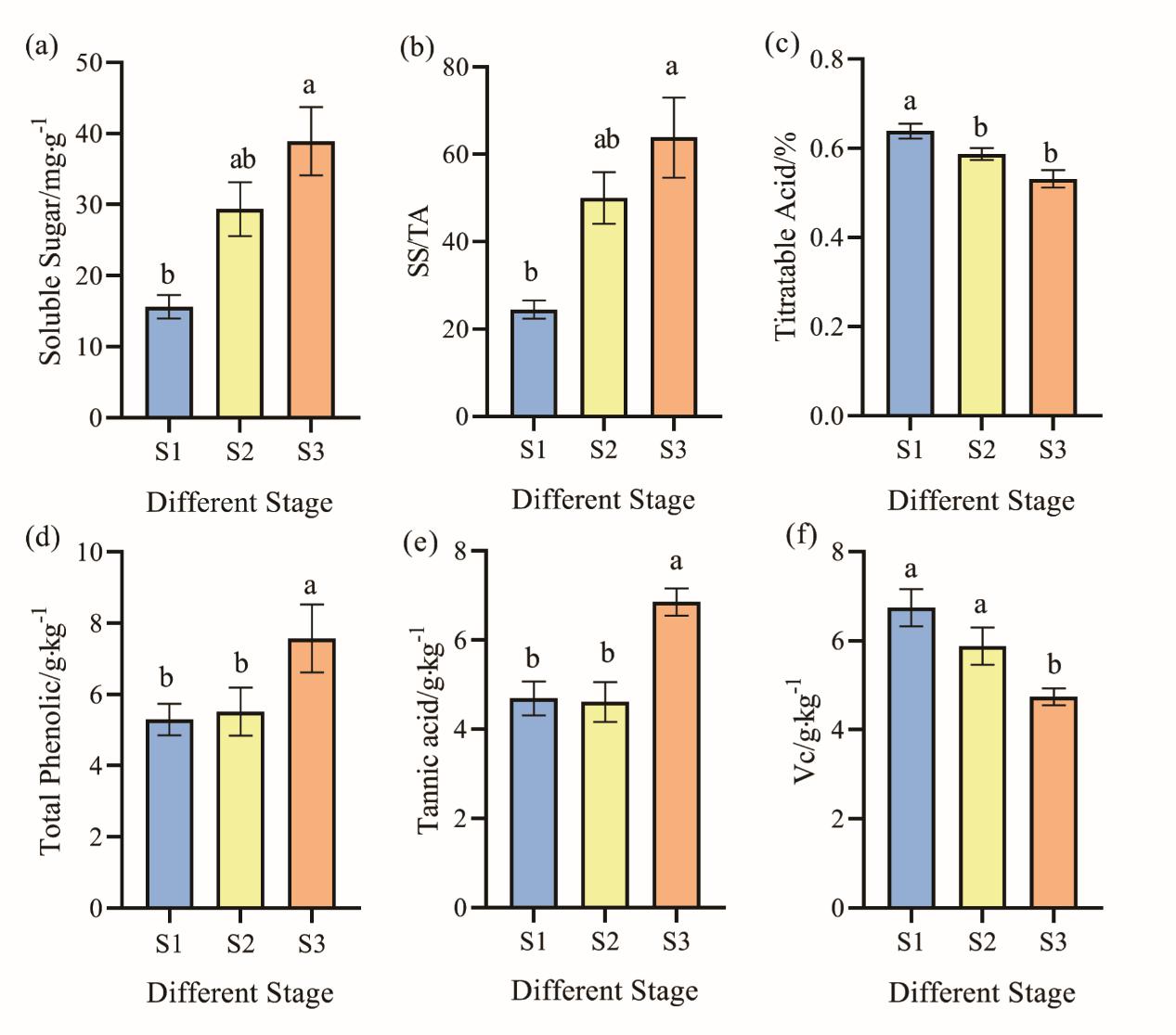 采用LC3000型高效液相色谱仪测定有机酸含量。本研究检测到36种有机酸。大约1/2有机酸代谢物如水杨酸、泛酸以及没食子酸等随着浆果的成熟而逐渐降低,主要集中在S1时期;大约1/4的有机酸代谢物如酒石酸、富马酸和苯甲酸等在S2时期含量最多,大于1/4的有机酸代谢物如莽草酸、L-苹果酸和齐墩果酸等随着浆果的成熟而逐渐增加,主要集中在S3时期。琐琐葡萄浆果中含量最多的是酒石酸、且在S2时含量最高为37196.67 mg/kg。此外,检测到琐琐葡萄浆果中齐墩果酸含量较高,齐墩果酸在S1、S2和S3的含量分别为194.33 mg/kg、224.424 mg/kg和230.064 mg/kg。成熟过程中两两比较均检测到8种差异代谢物。其中,S1 vs S2和S1 vs S3均有6种上调和2种下调差异代谢物;S2 vs S3有3种上调和5种下调差异代谢物。利用KEGG数据库对浆果不同成熟度的差异代谢物参与的代谢通路进行富集分析。S1 vs S2、S1 vs S3、S2 vs S3的差异代谢物富集到代谢通路一致,且共同富集到代谢通路为代谢途径、次生代谢的生物合成、TCA循环、乙醛酸和二羧酸代谢、丁酸代谢、氨基酸生物合成以及丙氨酸、天冬氨酸和谷氨酸生物合成。琐琐葡萄中有机酸代谢与可滴定酸测定结果基本趋于一致。表明琐琐葡萄中有机酸降低时由于有机酸酸作为糖酵解、三羧酸循环及糖异生作用的基质被消耗。