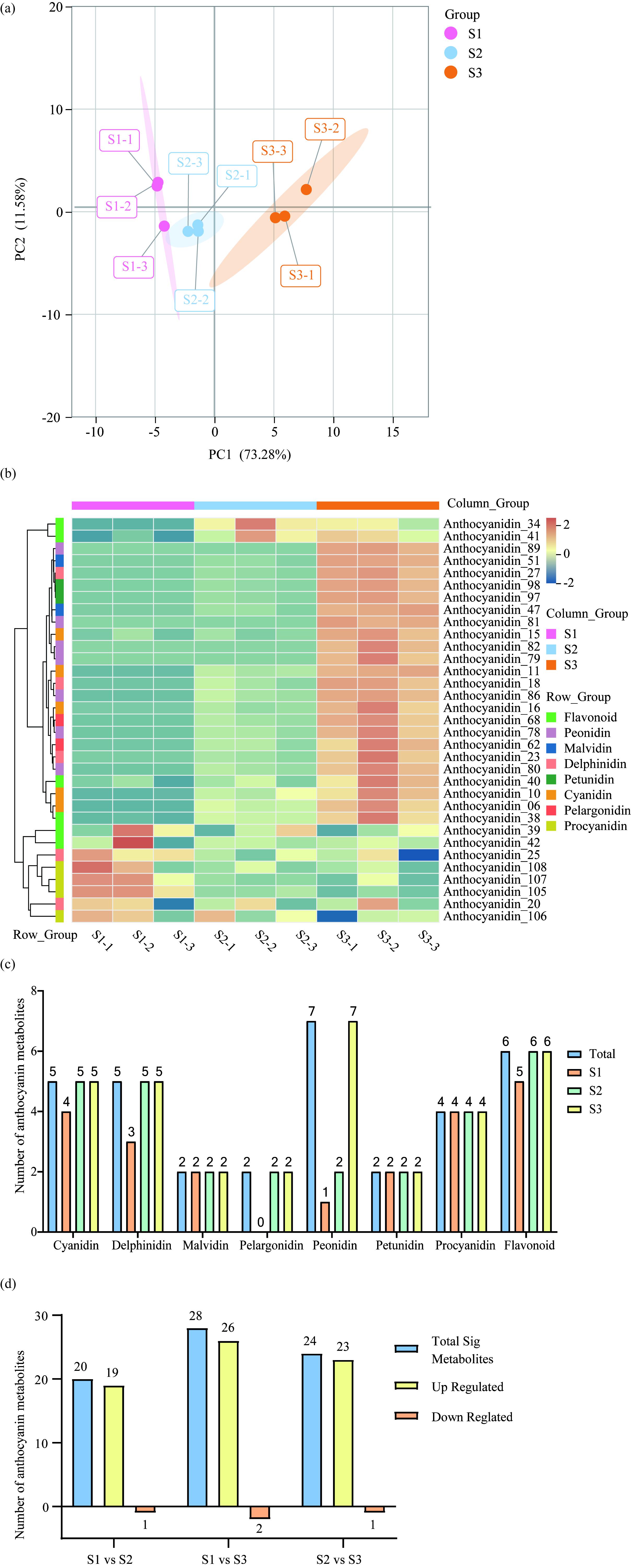 图4 琐琐葡萄浆果成熟过程中不同阶段花青素代谢产物