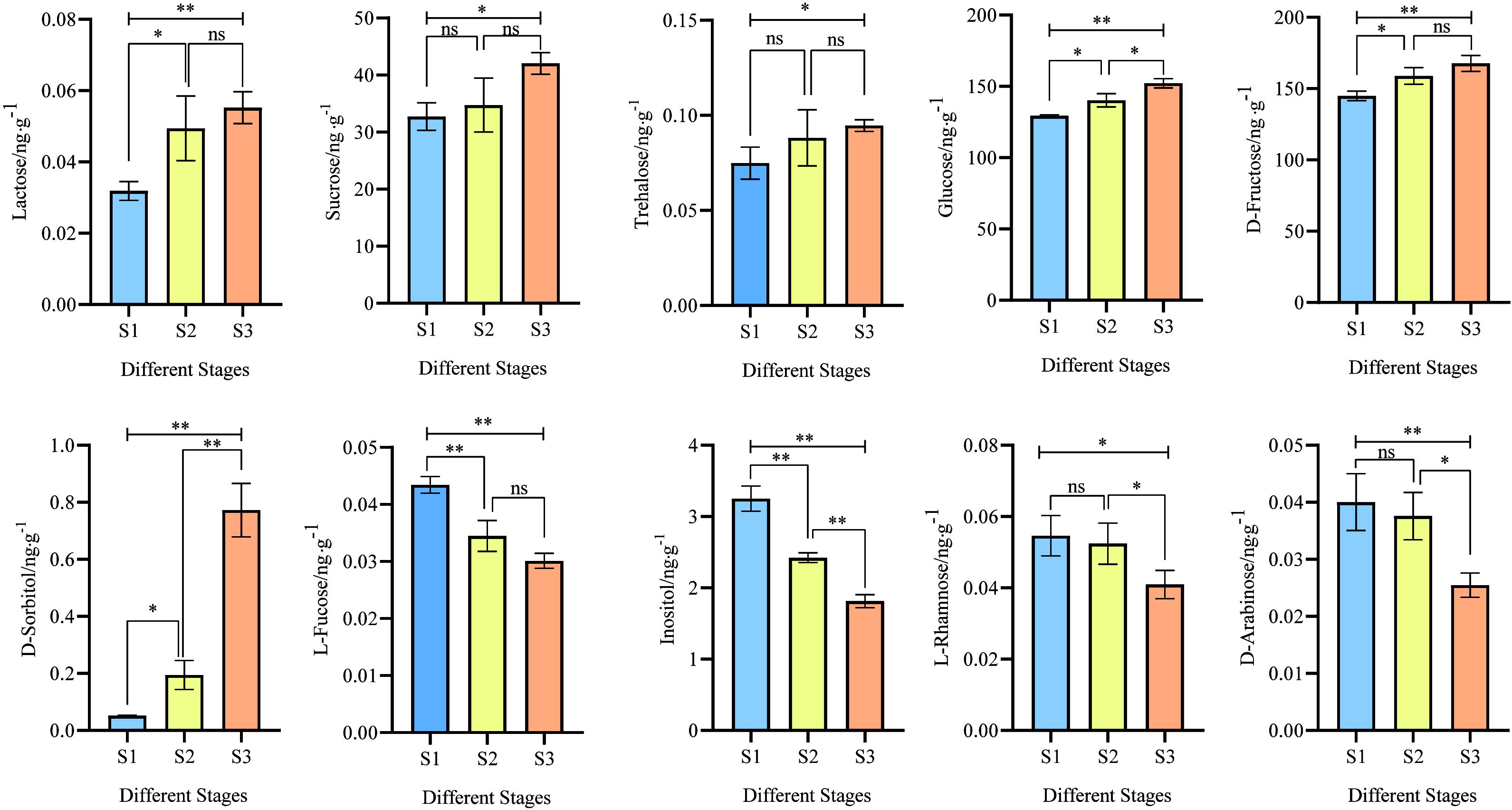 图5 琐琐葡萄成熟过程中不同发育阶段糖含量差异分析