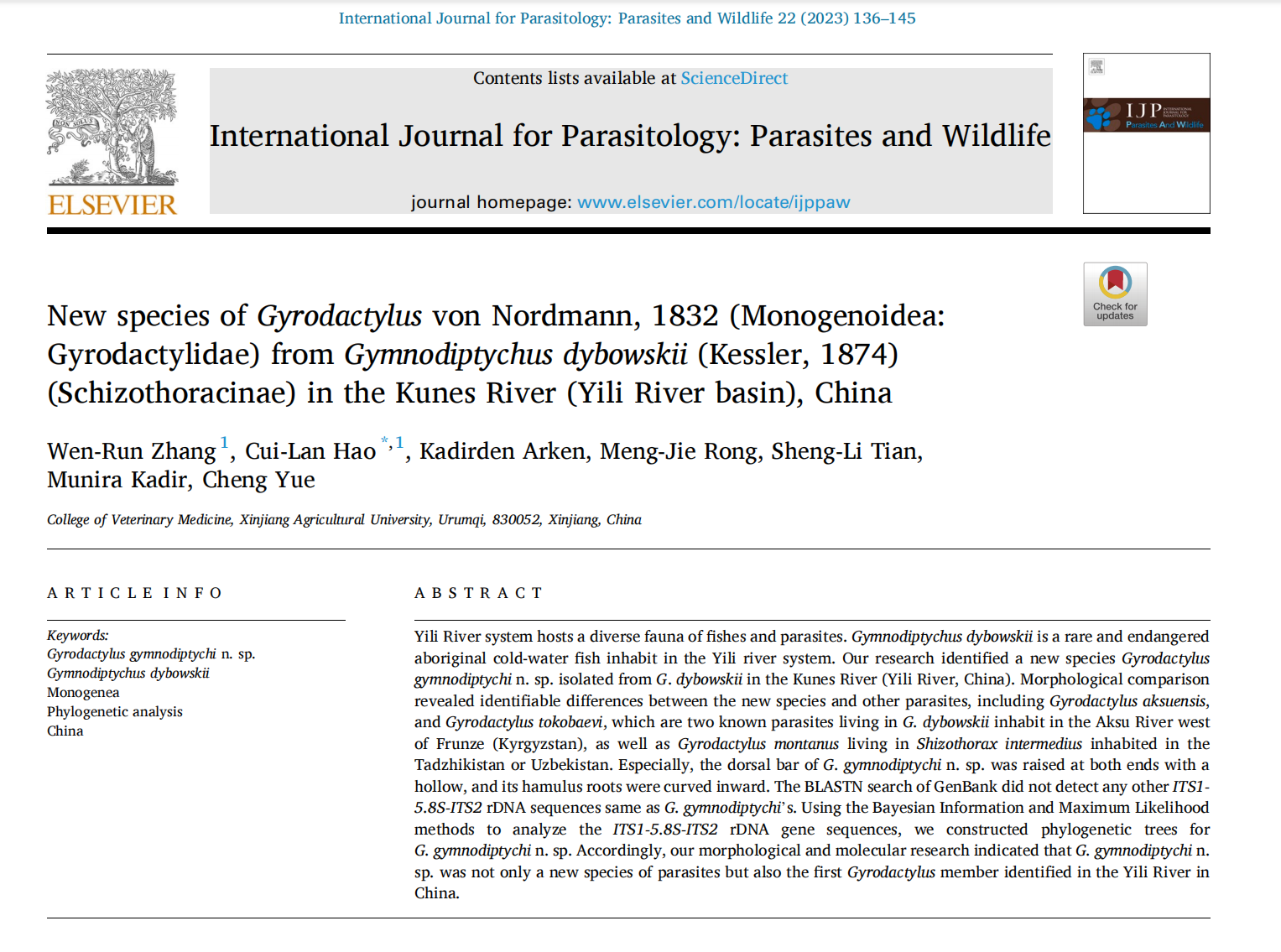 近日,星空彩票体彩版动物医学学院郝翠兰在International Journal for Parasitology: Parasites and Wildlife 在线发表了论文“New species ofGyrodactylus von Nordmann, 1832(Monogenoidea: Gyrodactylidae) from Gymnodiptychus dybowskii(Kessler, 1874) (Schizothoracinae) in the Kunes River (Yili River basin), China”的研究论文。该文报道了新疆土著鱼类新疆裸重唇鱼(Gymnodiptychus dybowskii)体表寄生的三代虫一新种,首次描述了其基本形态,结合分子生物学方法对该虫的ITS1-5.8S-ITS2 rDNA基因序列构建了系统发育树,以确定该虫为一新种。
