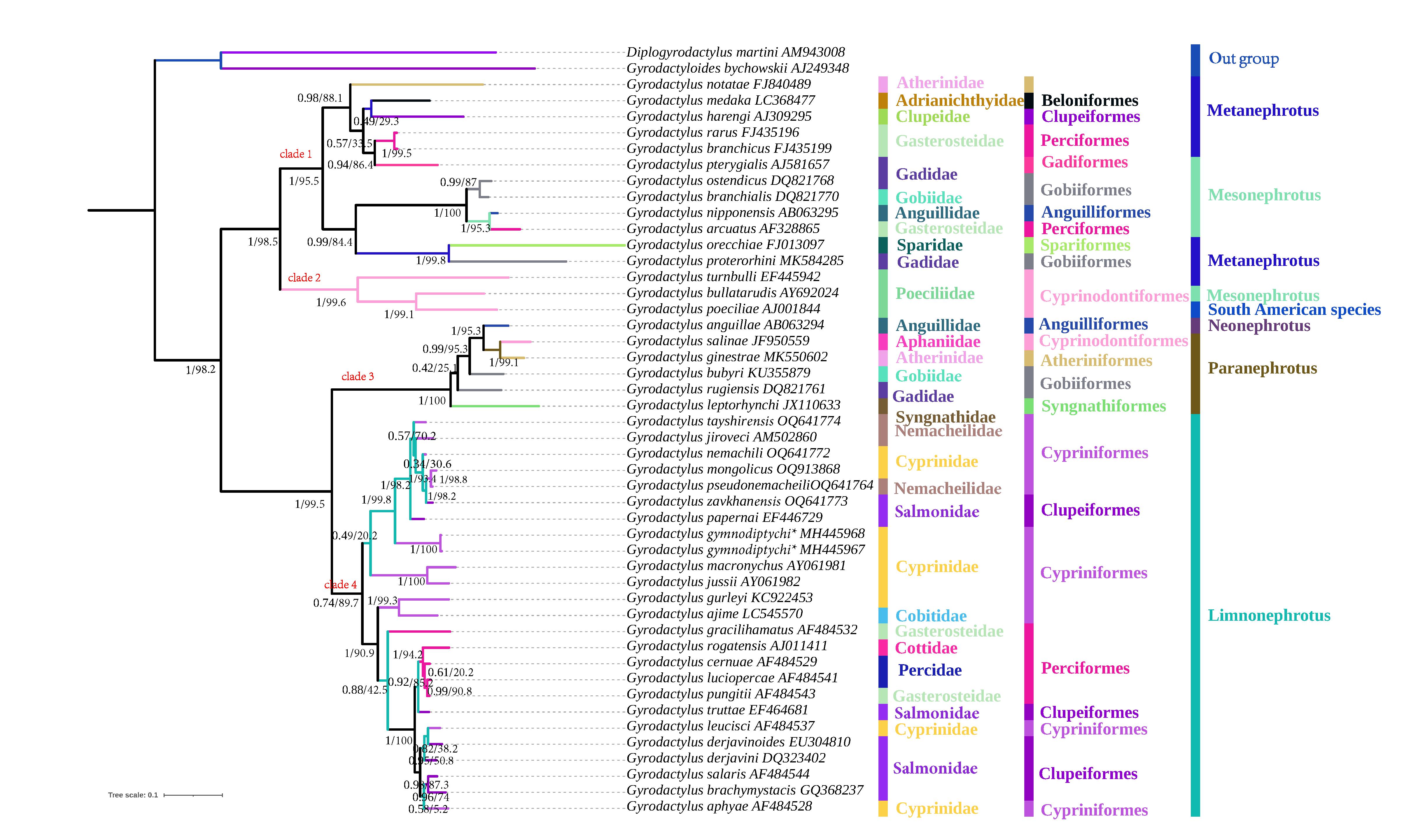 ITS1-5.8S-ITS2 rDNA片段BLASTn的结果显示,该虫的序列与GenBank中的已公开的三代虫序列均不一致,利用BLASTn对该5.8s rDNA序列比对发现,裸重唇三代虫属于Limnonephrotus亚属成员。通过BI和ML方法构建系统发育树,结果指出所有的三代虫类群都被划分为两个主要的进化谱系,并进一步划分为四个分支。此外,裸重唇三代虫与23个Limnonephrotus亚属的三代虫聚为一支,且与来自俄罗斯、蒙古和捷克河流的鱼类的几个三代虫成员密切相关(图3)。