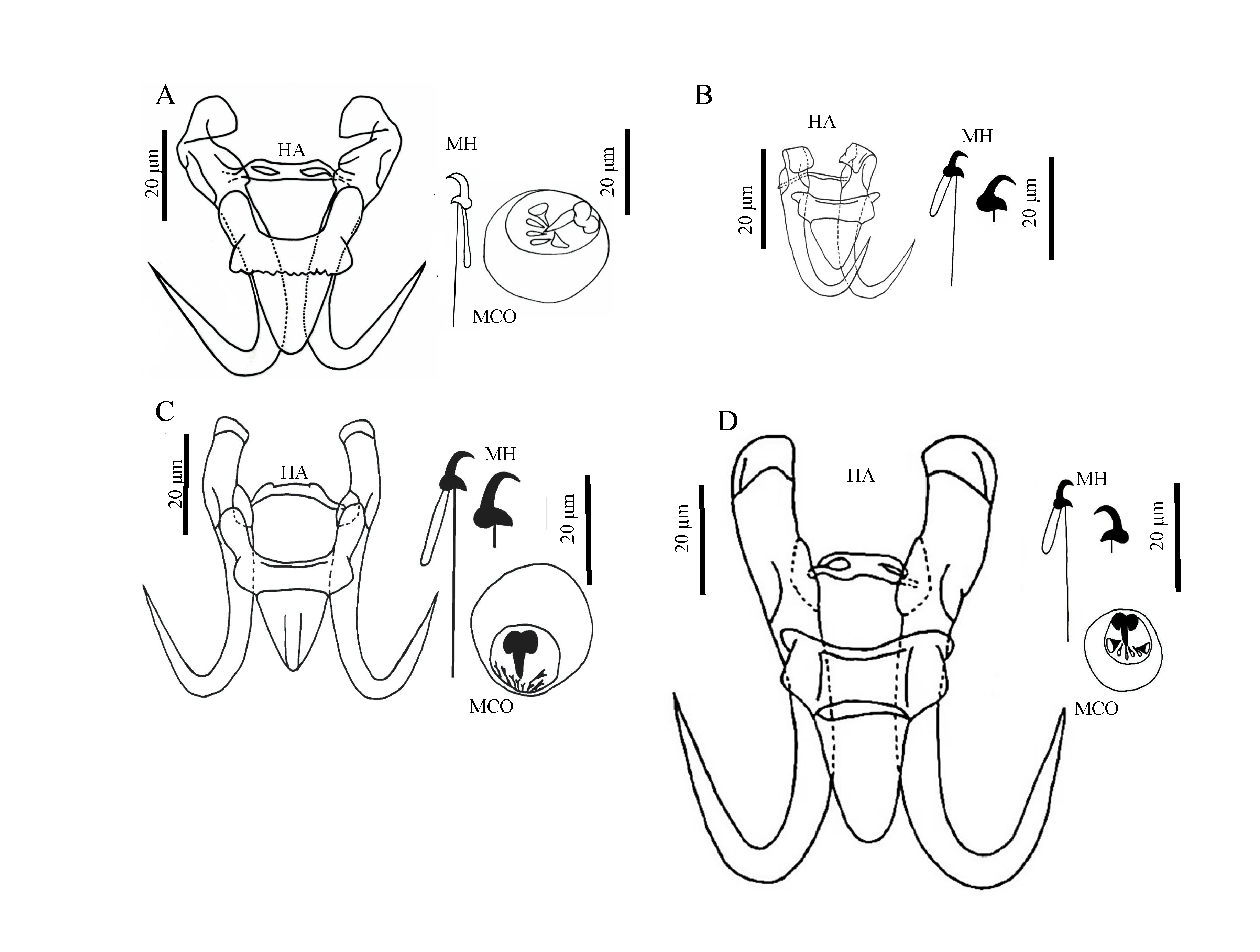 通过对裸重唇三代虫与已知三代虫的形态学特征比较发现,该虫与其他三代虫成员之间具有可识别的形态学差异。裸重唇三代虫具有钩基部弯曲且背联接片中空的独特特征,与寄生在裂腹鱼鱼类上的其他11种三代虫具有明显的差异(图2)。