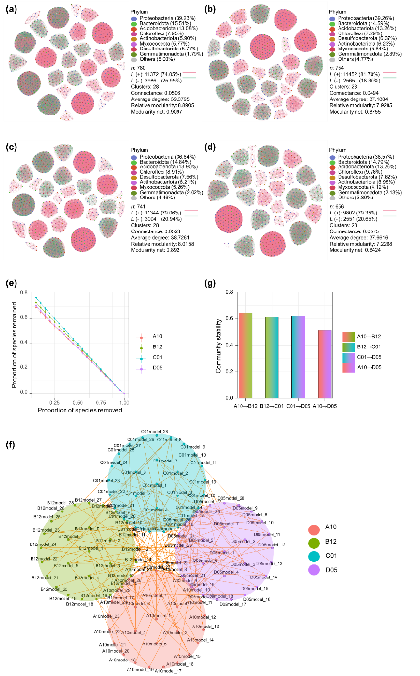 网络分析显示,细菌群落组成没有发生显著变化,展示了冻结和融冻期间细菌群落结构(门水平)的相对稳定。基于网络稳健性和群落组成稳定性角度,没有发生阶段性显著变化。季节性冻融期细菌群落的相对稳定性通过网络相似性模块验证。在剧烈的水热条件变化下,高寒湿地土壤细菌群落网络的复杂性和稳定性在冻融期能够保持相对稳定(图2)。