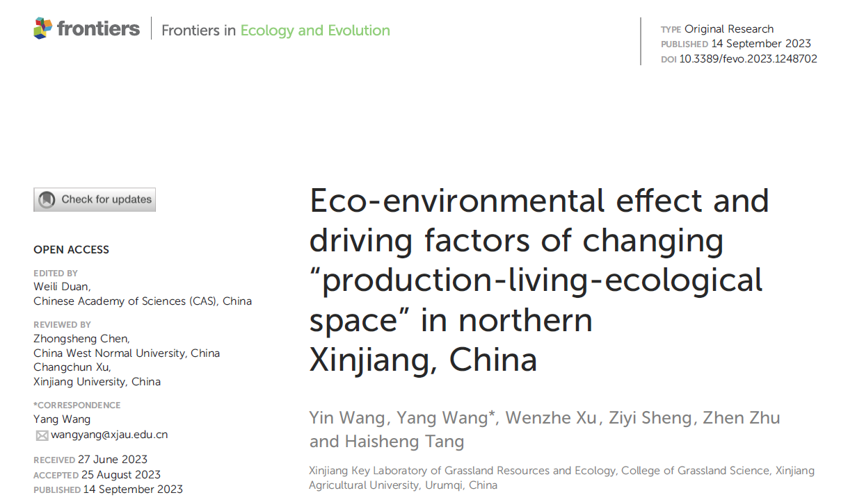 近日,Frontiers in Ecology and Evolution在线发表了星空彩票体彩版汪洋老师团队题为“Eco-environmental effect and driving factors of changing “production-living-ecological space” in northern Xinjiang, China”的研究论文,该研究以新疆天山以北地区为研究对象,运用网格单元法,结合生态环境质量指数,全局自相关模型、核密度估计等方法分析2000-2020年“三生空间”演变的生态环境效应时空分异特征,并借助地理探测器模型揭示生态环境质量的空间分异机制。