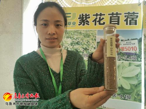 在“一带一路”饲草料产业发展高峰论坛暨首届“疆草之星”颁奖典礼上,新疆迈特威草业有限公司区域经理朱丽正在展示高产苜蓿种子。记者江斌伟摄