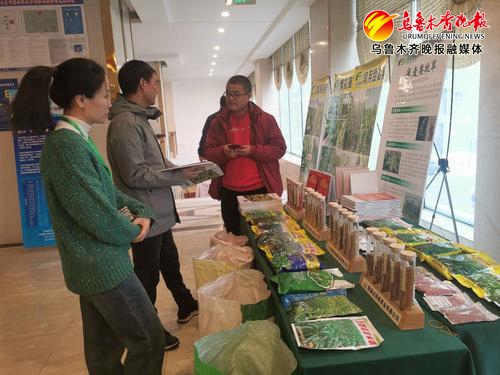 在“一带一路”饲草料产业发展高峰论坛暨首届“疆草之星”颁奖典礼上,新疆迈特威草业有限公司正在展示相关种子产品,吸引了几位与会者参观了解。记者江斌伟摄