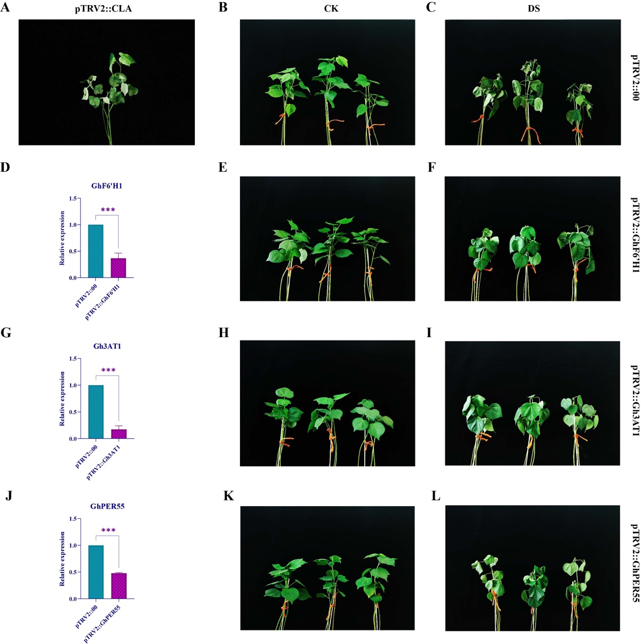 根据BSA-seq定位到的每个性状的QTL定位区间,选择A13(3.2 Mb)、A10(2.45 Mb)和A07(0.62 Mb)染色体上共6.27Mb的QTL区间作为本研究的重点。根据注释信息和qRT-PCR分析,筛选出可能参与棉花干旱胁迫反应的3个关键基因:GhF6‘H1、Gh3AT1和GhPER55。并对这些关键基因展开初步的功能验证,证实了关键基因对棉花抗旱性的重要影响。该研究以棉花抗旱性的关键指标为研究对象,为快速挖掘棉花抗旱候选基因奠定了基础,为棉花抗旱性的定向分子育种提供了遗传资源。