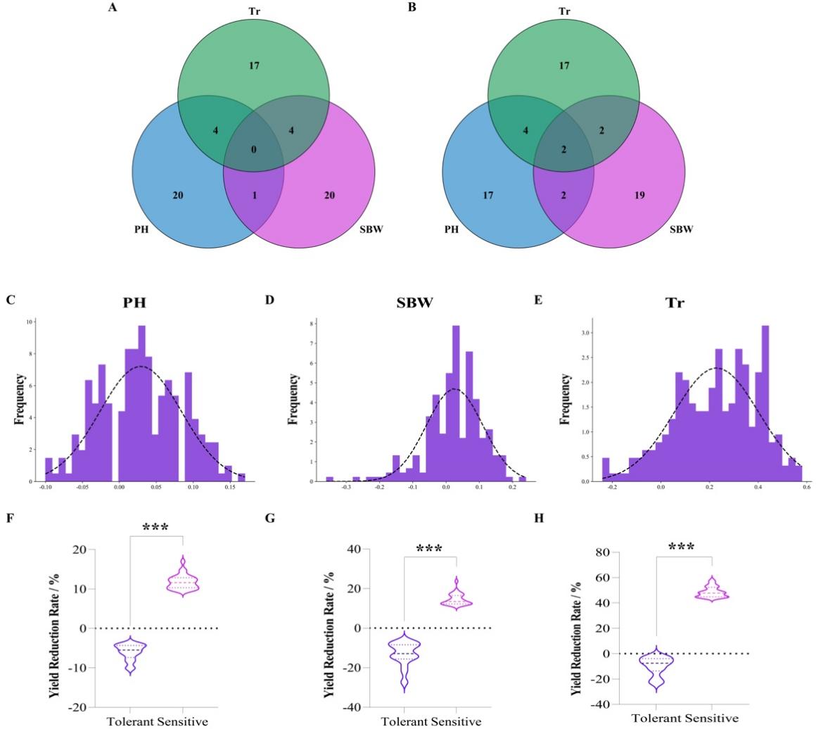 同时,基于这3个关键指标,构建了三组BSA-seq极端混合池。对极端材料的PH相对变化率、SBW相对变化率、Tr相对变化率进行正态分布及T检验分析,3个性状的极端相对变化率均具有极显著性差异,对极端材料的抗旱性鉴定至关重要(图2)。