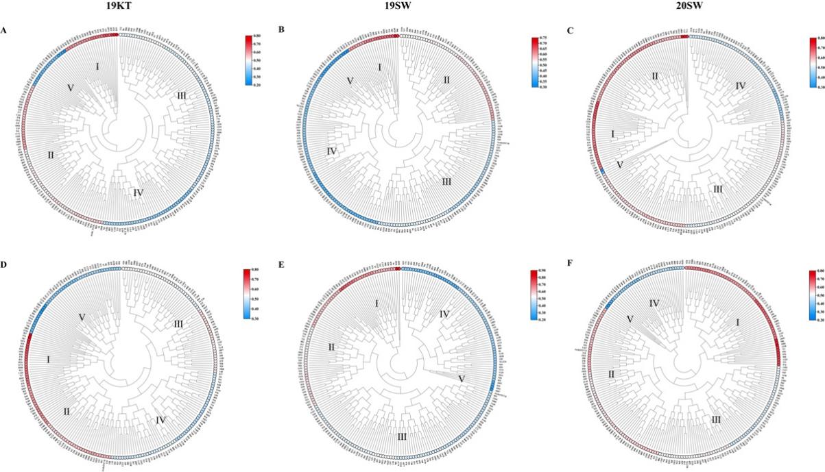 抗旱关键指标的聚焦对于快速挖掘出棉花抗旱相关候选基因具有重要的意义。在本次研究中陈全家团队对抗旱相关重组自交系群体进行了花铃期抗旱性鉴定,基于3个环境点2019KT、2019SW、2020SW调查的18、21、22个性状指标进行聚焦,将关键性状指标再次聚焦到株高(PH)、单铃重(SBW)和蒸腾速率(Tr)等3个指标上,并以这三个指标计算D1值,与抗旱性度量值D值进行群体抗旱性鉴定的结果大致相同(图1)。