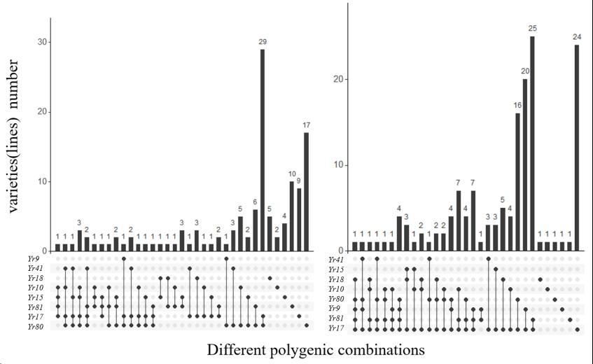 利用与Yr5、Yr9、Yr10等抗条锈病基因相连的分子标记对新疆小麦品种进行抗条锈病基因检测,结合苗期鉴定结果综合分析发现,Yr17+Yr80和Yr17+Yr81的抗性基因组合在春小麦和冬小麦中的占比最多,Yr17和Yr9的协同作用可以有效提高小麦对条锈菌的抗性,Yr5和Yr15等对条锈病具有较强抗性的基因在新疆小麦中占比较少。本研究为新疆小麦抗条锈病育种提供给重要的参考价值。