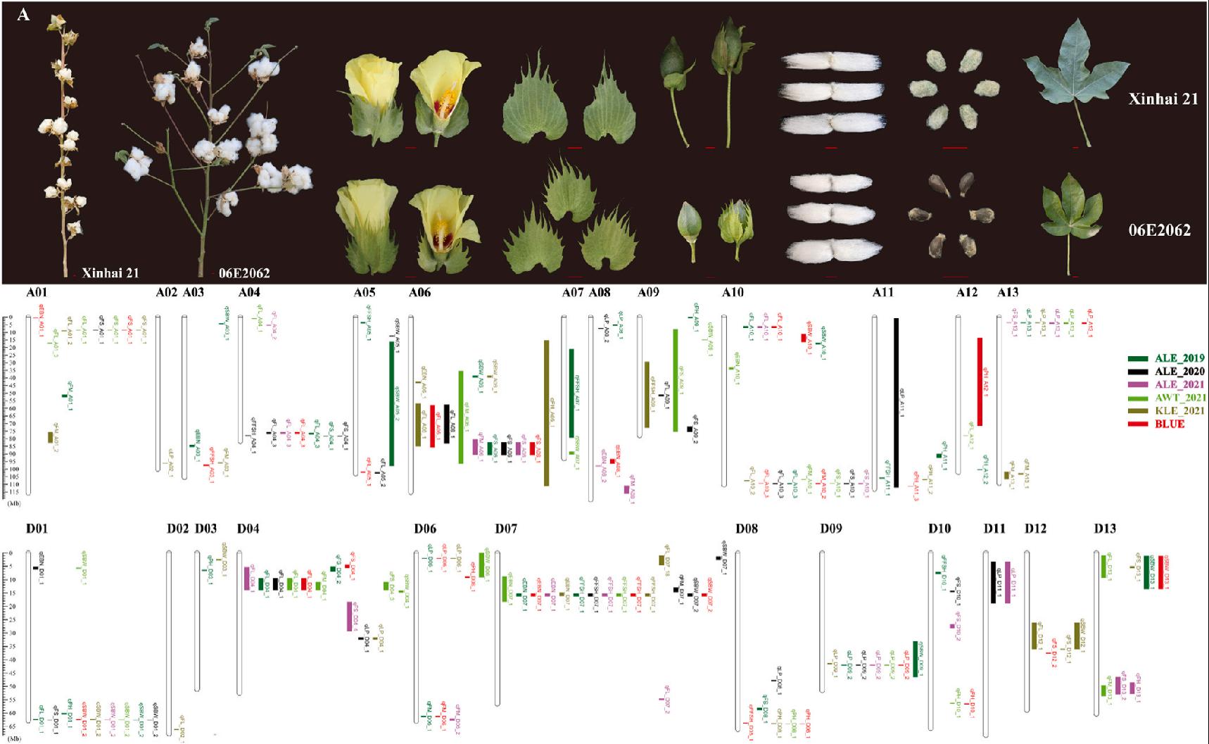 随着测序技术的进步和成本的不断降低,导致全基因组范围内标记开发成本降低且速度加快,由此出现了许多基因定位的方法。比如全基因组关联分析,高密度遗传连锁图谱QTL定位,BSA-seq等。在实际研究中,往往会将多种方法联合起来,例如使用QTL定位或者BSA-seq配合RNA-Seq够对目标性状特异基因快速的完成定位和功能分析。本研究以来自美国的06E2062和新疆大面积推广材料新海21为亲本构建了重组自交系(RIL)群体。综合分析了双亲本和RIL群体的表型特征,以及RIL群体的表型相关性、遗传力和遗传模型。采用全基因组重测序技术构建了包含5295个bin标记,总遗传图谱距离为2721.79cM的高密度遗传连锁图谱。利用5种不同环境下的表型数据检测到169个QTL位点。包含30个与农艺性状相关的QTL,61与产量性状相关QTL个,78个与纤维品质性状相关QTL,发现了两个与衣分紧密连锁的bin标记可作为育种标记。(图1)。