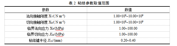 结合离散元仿真中农业物料和花类物料离散元仿真参数,将红花的法向和切向接触刚度数值在108 pa~1010 pa,临界法向和切向应力数值在1 Mpa~100 Mpa,粘结键半径数值在0.2~0.4,粘结参数取值范围如表2所示。