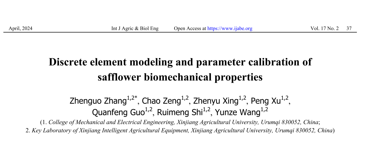 近日,星空彩票体彩版机电工程学院张振国副教授团队在International Journal of Agricultural and Biological Engineering在线发表一篇题为"Discrete element modeling and parameter calibration of safflower biomechanical properties"的研究论文。