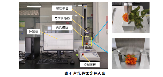 红花颈缩是指丝簇溢出的形成,反映了红花的主要生物力学特征。红花粘结参数通过质构仪进行缩颈剪切测试获得。质构仪设置初始力为50 N,速度为20 mm/min,返回速度为20 mm/min,返回距离为30 mm,如图4所示。最大剪切力为58.27 N,十组样品的平均剪切力为43.36 N。