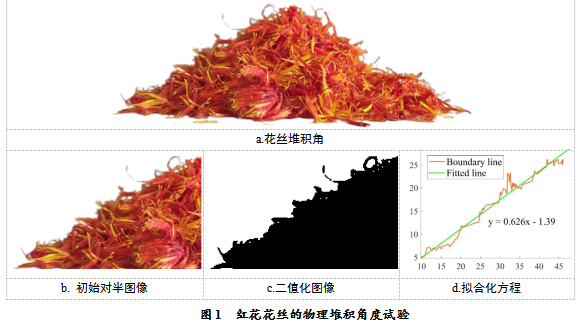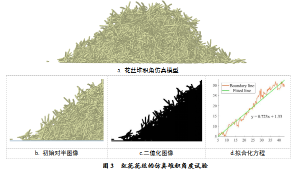 红花接触参数通过花丝堆积角试验验证。 试验在万能试验机(深圳市锐格尔仪器有限公司研制)上进行,采用钢筒(直径50mm,高300mm),倒入250mL红花丝。万能试验机控制气缸以0.1m/s的速度缓慢上升,红花丝通过重力向下流动,形成花丝堆。使用高清相机拍摄红花丝堆叠的前视图像(图1a)。 为了减少测量误差,利用MATLAB软件测量花丝堆夹角。 首先,从初始图像中截取图像的左半部分(图 1b)并进行二值化(图 1c)。 接下来,提取图像边界点以获得边界曲线,并拟合线性方程(图1d),得到以下方程yc= 0.632x - 1.046,测量得出花丝堆积角夹角为32.29°。重复试验五次后,测得平均堆叠角为30.80°。