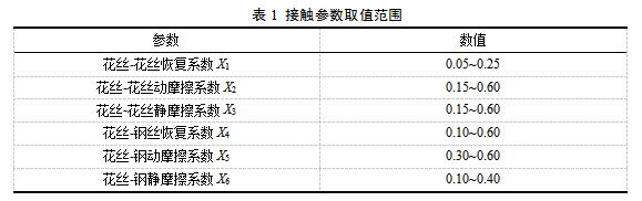 建立与堆积角试验相同的虚拟圆柱体(内径50mm、高300mm),圆柱体材料属性为钢,钢材料参数直接从EDEM软件素材库中提取:钢泊松比µs为0.3、密度ρs为7900 kg m-3和剪切模量Gs为7.94×1010 Pa。并在圆柱体顶部设置颗粒工厂,结合离散元仿真中农业物料和花类物料离散元仿真参数,确定花丝接触参数的取值范围如表1所示。