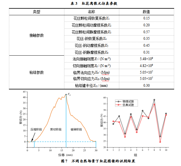 为了验证接触和粘结参数的准确性,在校准红花接触和粘合参数的最佳组合后,通过物理和模拟剪切试验验证了模型的准确性。以最高剪切力作为响应指标,其他设置条件保持不变,如表3所示。