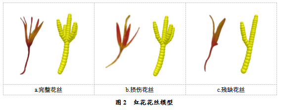 建立精确的花丝3D模型是验证红花接触参数的基础。根据自然生长状态和实际收获过程建立了丝状模型。 单个细丝的损坏分为三种典型的细丝形态:完整的细丝(图2a)、受损的细丝(图2b)和残缺的细丝(图2c)。