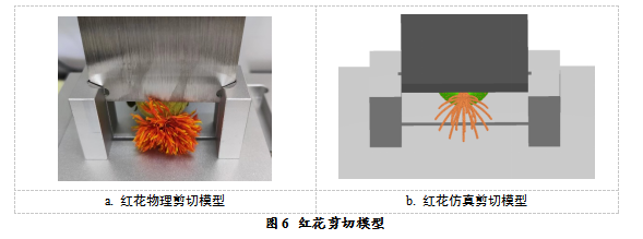根据红花物理剪切试验,如图6a所示。经过堆积角试验确定好红花接触参数后,建立与质构仪剪切试验相同的虚拟三维刀座和刀具模型(材料属性为钢材料),进行离散元仿真剪切试验标定红花粘结参数,如图6b所示。设置刀具初始速度20 mm/min、剪切距离35 mm。