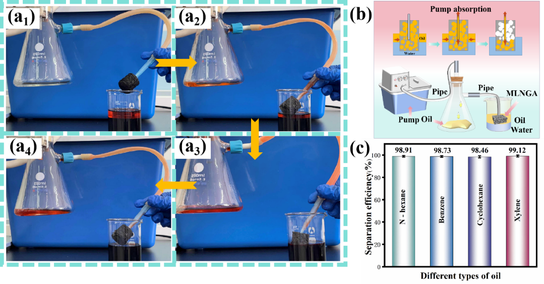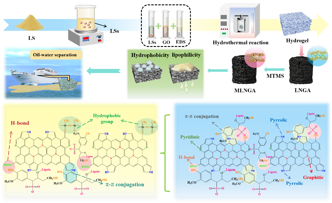 海上溢油和有机污染物的排放对生态系统和经济造成了重大危害。因此,迫切需要实施高效的油水分离,以减少由此造成的环境污染,促进资源恢复。目前,为解决溢油问题,油水分离材料已被深入开发。然而,分离材料的机械强度和分离效率是应用中的挑战,由于三维(3D)多孔材料吸附剂具有低表面能和高疏水性,在油水分离上具有独特的优势。而木质素具有独特的芳香型结构,因此基于静电排斥,从而调控气凝胶的层间间距,对增强材料的机械强度和分离效率具有重要意义。