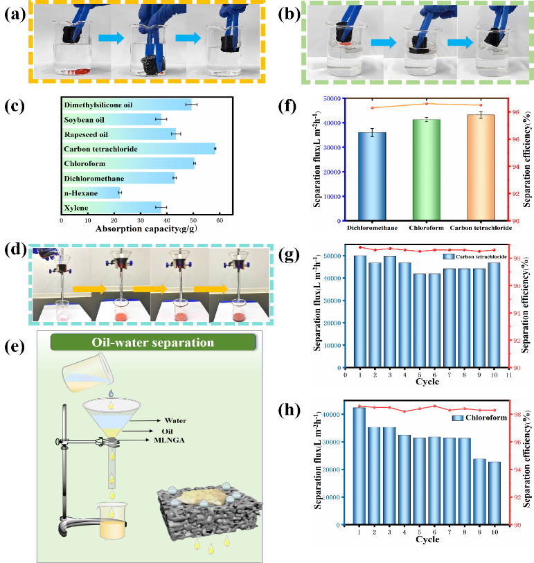 图2. (a)MLNGA吸附水中二氯甲烷图像(油红染色);(b)MLNGA在水中吸附正己烷的图像(油红染色);(c)MLNGA对二甲苯、正己烷、二氯甲烷、氯仿、四氯化碳、大豆油、菜籽油和二甲基硅油的吸收能力图;(d)MLNGA重力连续分离图像;(e)MLNGA重力连续分离示意图;(f)MLNGA对二氯甲烷、氯仿和四氯化碳的分离通量和效率;(g)经过10次循环分离,MLNGA回收四氯化碳;(h)分离10次后MLNGA对氯仿的回收率。