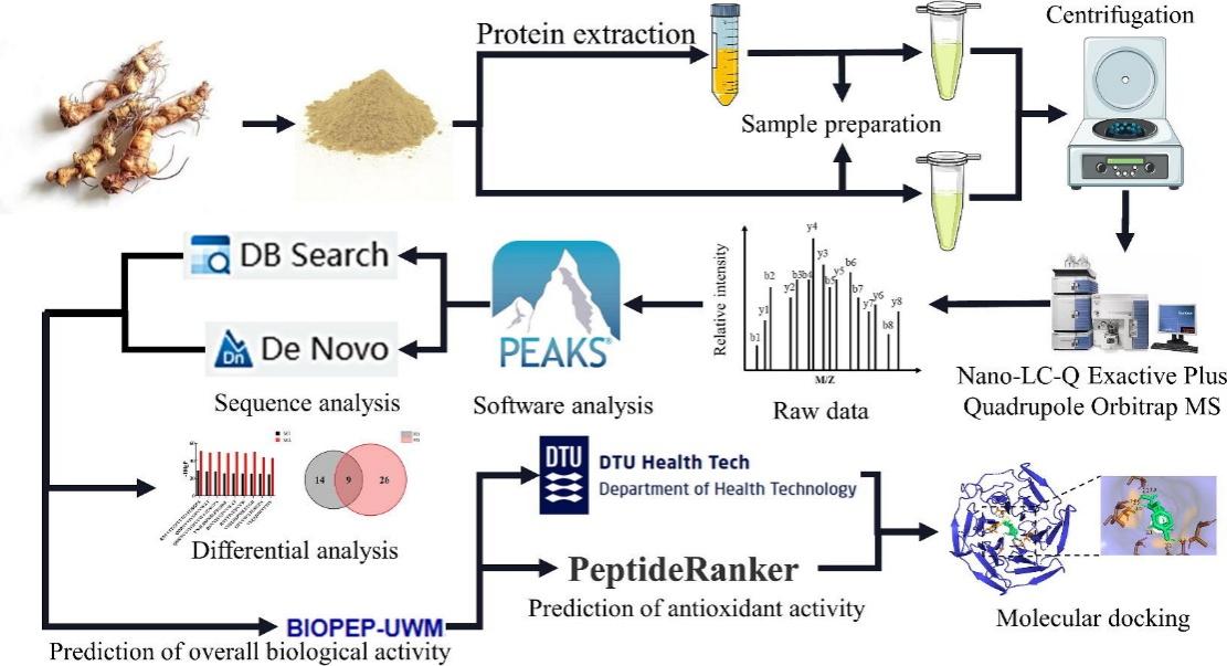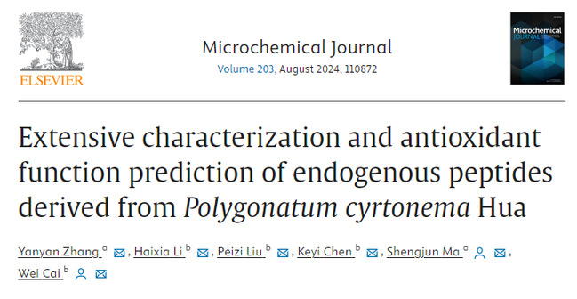 多花黄精(Polygonatum cyrtonema Hua)是一种药食同源的多年生草本植物,具有治疗呼吸道疾病、调节免疫功能和增强肝脏健康的悠久传统。目前研究表明,多糖、皂苷和黄酮是多花黄精的主要活性成分,而生物活性肽作为一类影响药效的大分子往往遭到忽视。生物活性肽根据其来源可分为外源肽或内源性肽。外源肽通常因其较高的丰度以及目标性受到更多关注。然而,与植物生物系统兼容的内源性肽拥有更高的安全性的同时,可以作为特定植物物种的生物标记。尽管如此,目前在肽组学领域中,内源性肽的序列和丰度在很大程度上是未知的。