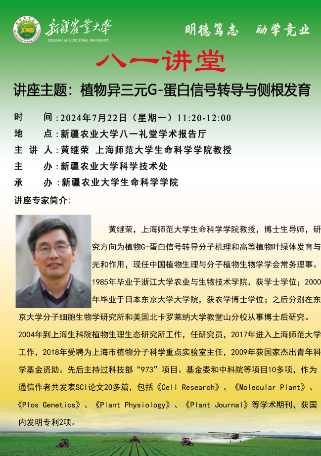 【八一讲堂预告】六十六期:植物异三元G-蛋白信号转导与侧根发育