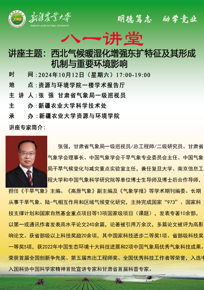 【八一讲堂预告】七十四期:西北气候暖湿化增强东扩特征及其形成机制与重要环境影响