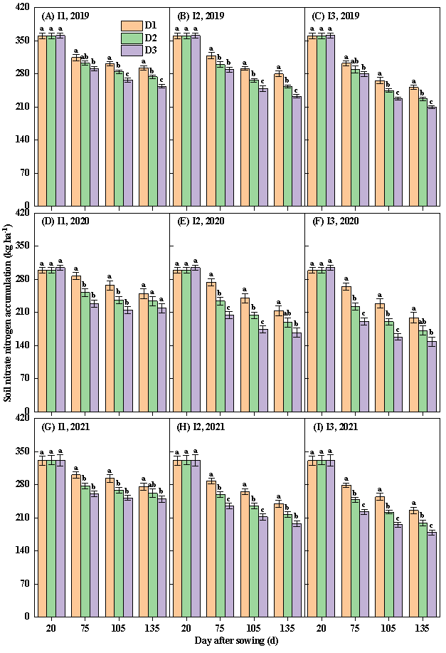 图3 灌溉量和种植密度对棉田土壤硝态氮积累量的影响