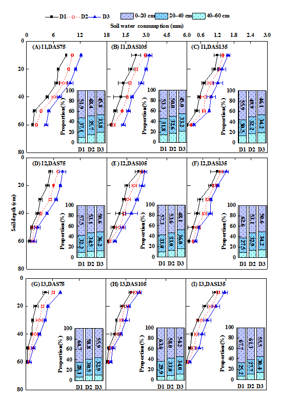 图2灌溉量和种植密度对不同土层土壤耗水量的垂直变化及比例的影响