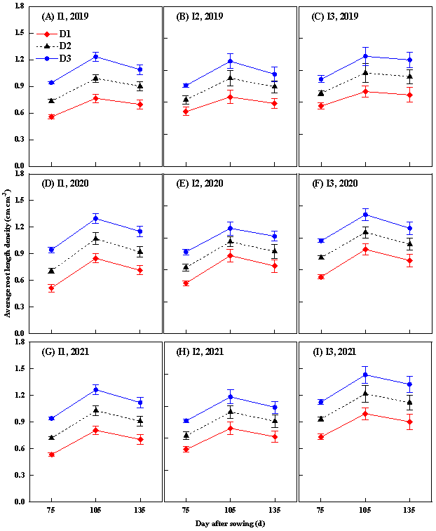 图1灌溉量和种植密度对棉花的平均根长密度的影响