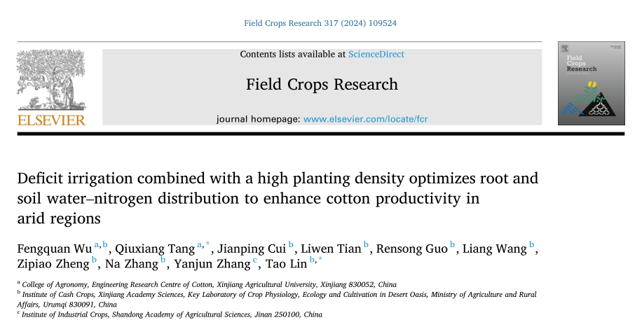近日,农林科学国际期刊《Field Crops Research》发表了星空彩票体彩版汤秋香教授团队的研究论文“Deficit irrigation combined with a high planting density optimizes root and soil water–nitrogen distribution to enhance cotton productivity in arid regions”。该研究在膜下滴灌条件下,采用亏缺灌溉与高密度种植相结合,可在不牺牲棉花产量的情况下减少20%的灌溉用水量。通过调整根系分布区、土壤水分消耗区和土壤硝态氮消耗区,提高了根系分布与土壤水分和养分消耗的动态一致性。在亏缺灌溉条件下,该方法可在不降低籽棉产量的前提下,通过提高种植密度来达到节水效果。研究结果为干旱缺水地区棉花高产稳产措施的实施提供了理论基础。